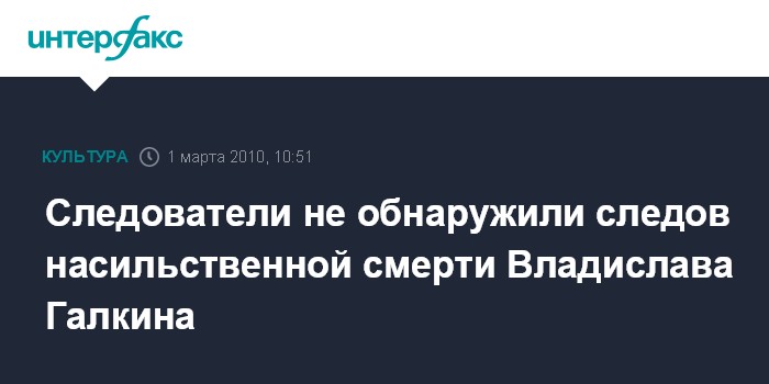 Москва. 1 марта. INTERFAX.RU - Следствие не обнаружило признаков насильственной смерти актера Владислава Галкина, сообщил "Интерфаксу" официальный представитель Следственного управления СКП РФ по Москве в понедельник.