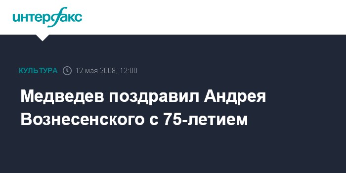 Москва. 12 мая. INTERFAX.RU - Президент РФ Дмитрий Медведев поздравил поэта, прозаика, лауреата Государственной премии СССР Андрея Вознесенского с 75-летием, сообщает пресс-служба главы государства.