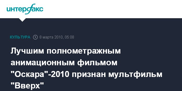 Москва. 8 марта. INTERFAX.RU - "Оскар" в номинации Лучшая полнометражная анимационная лента 2010 года получил мультфильм "Вверх". Также номинированы были "Коралина в стране кошмаров", "Бесподобный мистер Фокс", "Принцесса и лягушка", "Брэндан и секрет келлов".