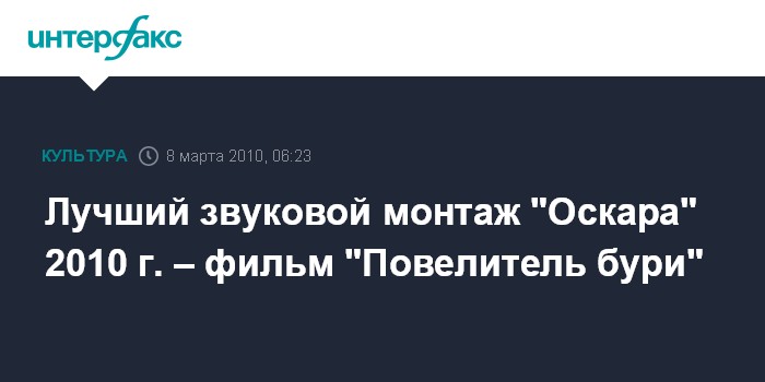 Москва. 8 марта. INTERFAX.RU - Премии Академии за Лучший звуковой монтаж удостоился "Повелитель бури" — Пол Н. Дж. Оттосон.