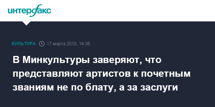 Москва. 17 марта. INTERFAX.RU - Министр культуры РФ Александр Авдеев заявил, что по блату никому из артистов почетные звания в России не присваиваются. "Никому не даем по блату. Даем по заслугам и по художественному вкладу", - заявил глава Минкультуры, отвечая на вопросы депутатов Госдумы в рамках "правительственного часа" в среду.