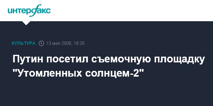 Шушары (Ленинградская область). 13 мая. INTERFAX.RU - Премьер-министр РФ Владимир Путин побывал во вторник на съемочной площадке фильма Hикиты Михалкова "Утомленные солнцем-2". Никита Михалков провел премьер-министра по съемочной площадке, рассказал, что сейчас снимается один из эпизодов фильма, и предложил ему посидеть в кресле режиссера.
