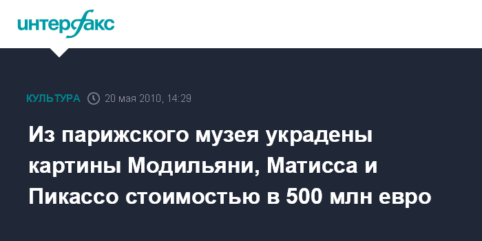 Париж. 20 мая. INTERFAX.RU - Картины, совокупная стоимость которых оценивается в 500 млн евро, украдены в четверг из парижского музея современного искусства, сообщают местные СМИ.