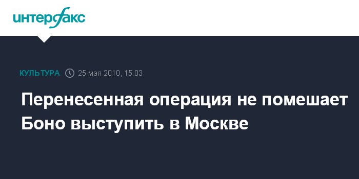 Москва. 25 мая. INTERFAX.RU – Концерт группы U2 в Москве 25 августа состоится, несмотря на появление в СМИ информации об операции, перенесенной лидером коллектива Боно, заявили организаторы российского выступления.