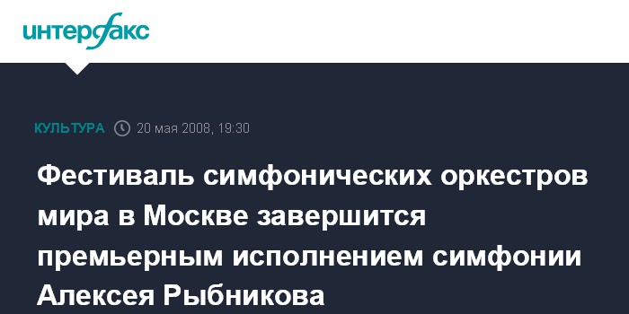 Москва. 20 мая. ИНТЕРФАКС - Мировая премьера шестой симфонии композитора Алексея Рыбникова состоится 12 июня на закрытии фестиваля симфонических оркестров мира, который стартует в Москве 1 июня.