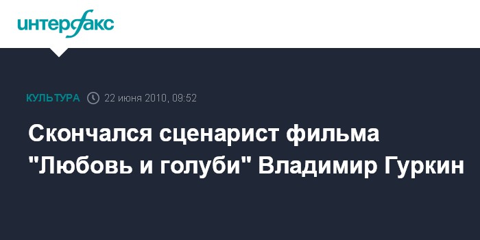 Москва. 22 июня. INTERFAX.RU - Известный драматург, автор сценария к фильму "Любовь и голуби" Владимир Гуркин ушел из жизни в понедельник на 59-м году жизни, сообщила агентству "Интерфакс-Сибирь" пресс-секретарь министерства культуры Иркутской области Любовь Васильева. "Неделю назад Владимир Гуркин почувствовал себя плохо, и друзья перевезли его в Иркутск. Здесь, в областном онкологическом диспансере, драматург умер", - отметила Васильева.