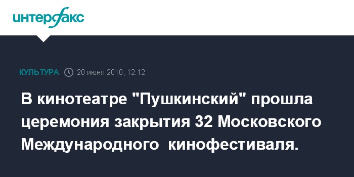 Москва. 27 июня. INTERFAX.RU – На церемонии президент ММКФ озвучил основную статистику фестиваля: 120 тысяч зрителей посетило сеансы фестиваля, за 10 дней было показано 340 фильмов (около половины – российская программа, проходившая в Доме кино), 17 из которых конкурсные.