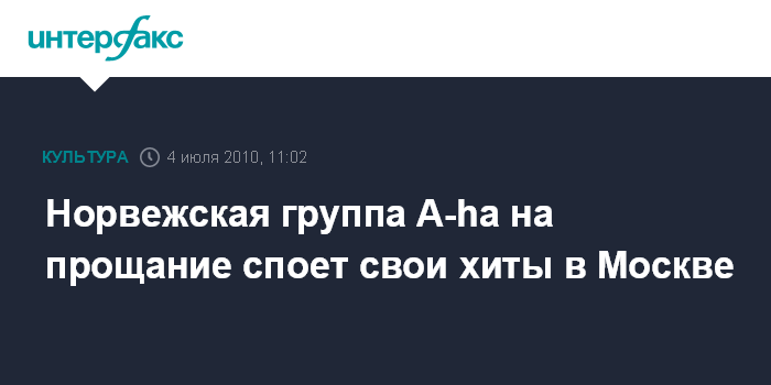 Москва. 4 июля. INTERFAX.RU - Знаменитая норвежская группа A-ha выступит в Олимпийском 9 ноября в рамках прощального мирового турне. В одном концерте "Ending on a high note" ("Прощание на высокой ноте") прозвучат 25 лучших хитов группы.