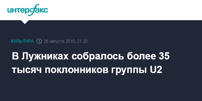 "По состоянию на 19:30 в чаше БСА "Лужники" собралось 35 тыс. зрителей и поклонников этой ирландской группы", - сообщил "Интерфаксу" руководитель оперативного штаба по обеспечению безопасности концерта в Лужниках, командир московского ОМОН Вячеслав Хаустов.