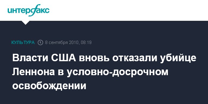 Вашингтон. 8 сентября. INTERFAX.RU - Нью-йоркское управление по условно-досрочному освобождению в шестой раз отказало Марку Дэвиду Чэпмэну, осужденному на пожизненное тюремное заключение в 1980 году за убийство Джона Леннона, сообщила американская телекомпания CNN.