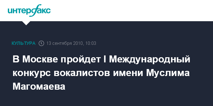 Баку. 13 сентября. INTERFAX.RU - Первый международный конкурс вокалистов имени Муслима Магомаева состоится в Москве, сообщается на официальном сайте управления культуры и туризма Баку. Мероприятие пройдет 23-24 октября 2010 года в концертном зале Крокус Сити Холл, участники конкурса смогут представить на суд жюри как классические, так и эстрадные произведения.