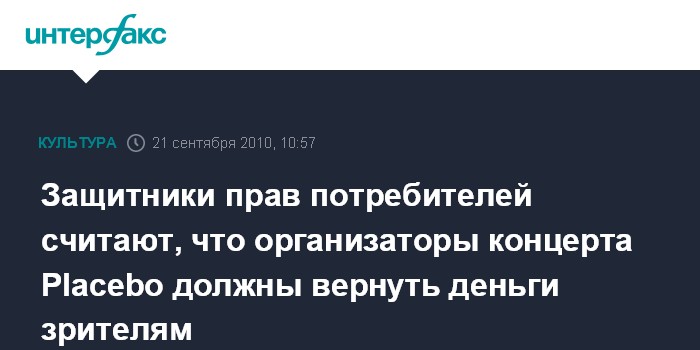 Москва. 21 сентября. INTERFAX.RU - Председатель правления Международной конфедерации обществ потребителей Дмитрий Янин считает, что организаторы концерта британской группы Placebo в московском клубе "Арена" должны компенсировать зрителям, как мининмум, две трети стоимости билетов, так как выступление было сорвано