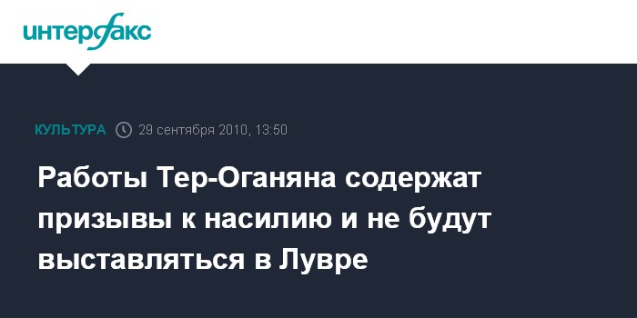Москва. 29 сентября. INTERFAX.RU - Произведения художника Авдея Тер-Оганяна были исключены из состава российской выставки "Контрапункт" в Лувре, поскольку могут быть восприняты как призывы к насилию, заявил замминистра культуры РФ Андрей Бусыгин.