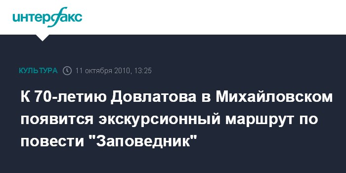 Псков. 11 октября. INTERFAX.RU - Пушкинский музей-заповедник "Михайловское" намерен к 3 сентября 2011 года, 70-летию Сергея Довлатова, создать экскурсионный маршрут по повести писателя "Заповедник", сообщила журналистам замдиректора музея по научным вопросам Елена Ступина.