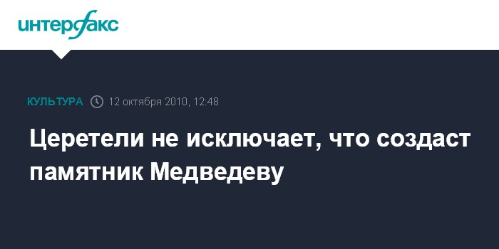 Москва. 12 октября. INTERFAX.RU - Известный скульптор Зураб Церетели заявил, что не исключает возможности создания памятника президенту России Дмитрию Медведеву.