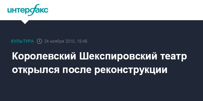 Лондон. 24 ноября. INTERFAX.RU - Королевский Шекспировский театр в британском городе Стратфорд-на-Эйвоне открылся после трехлетней реконструкции, сообщает в среду британская телерадиокорпорация BBC.