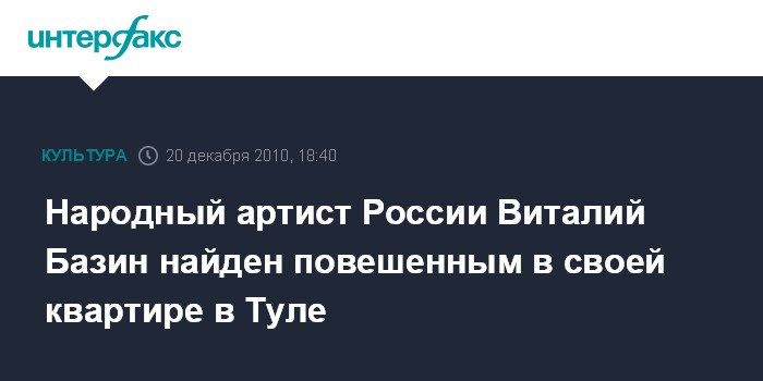 Тула. 20 декабря. INTERFAX.RU - В Туле в понедельник найден мертвым 62-летний актер Тульского академического театра драмы, народный артист России Виталий Базин.
