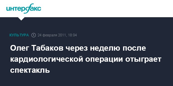 Москва. 24 февраля. INTERFAX.RU - Художественный руководитель МХТ Олег Табаков несколько дней назад перенес операцию, но уже 1 марта выйдет на сцену, сообщили "Интерфаксу" в пресс-службе МХТ в четверг.