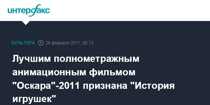 Москва. 28 февраля. INTERFAX.RU - "Оскар" в номинации Лучшая полнометражная анимационная лента 2011 года получил мультфильм "История игрушек", часть третья.