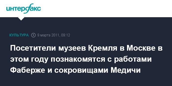 Москва. 9 марта. INTERFAX.RU - На выставках в Музеях московского Кремля (ММК) в этом году будут показаны произведения ювелира Карла Фаберже, фирмы "Картье", модельера Поля Пуаре, сокровищница Медичи, сообщила замдиректора ММК Зельфира Трегулова.