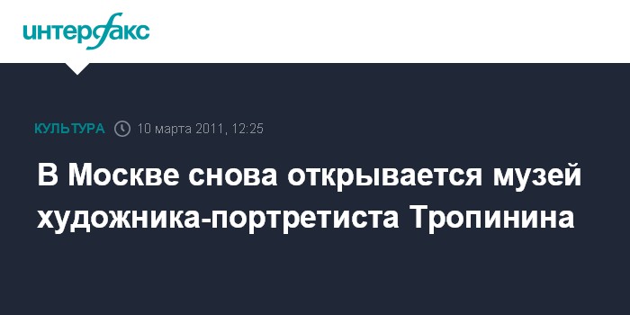 Москва. 10 марта INTERFAX.RU - В столице после длительной реставрации вновь открывается музей московского художника В.А.Тропинина. Основной тематической направленностью музея является история русского портретного искусства XVIII−XIX веков. Кроме того, в музее можно увидеть работы учителей и предшественников художника, а также произведения графики, декоративно-прикладного искусства XVIII-XIX веков.