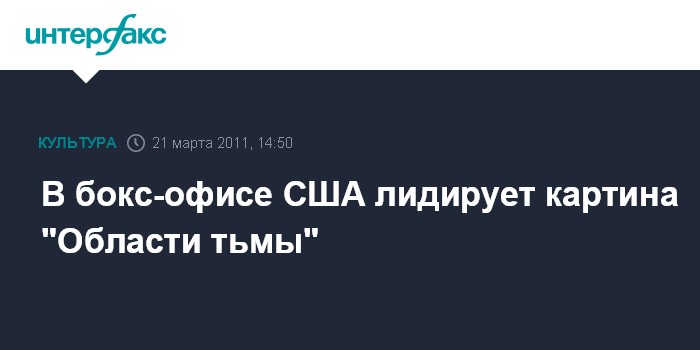 Москва. 21 марта. INTERFAX.RU - По предварительным данным о сборах фильмов в Североамериканском кинопрокате за прошедший уикенд (19-20 сентября) лидером является фильм " Limitless" студии Relativity. Картина, известная российскому зрителю как "Области тьмы" собрала в последние выходные 19 миллионов долларов.