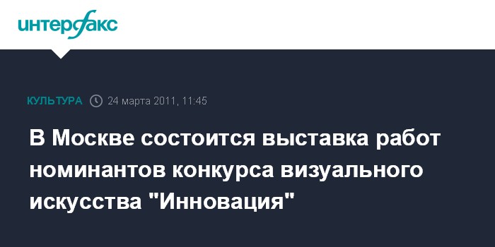 Москва. 24 марта. INTERFAX.RU - В столице с 29 марта по 8 мая 2011 пройдет выставка работ номинантов VI Всероссийского конкурса в области современного визуального искусства "Инновация". Выставка состоится в малом зале ГЦСИ.