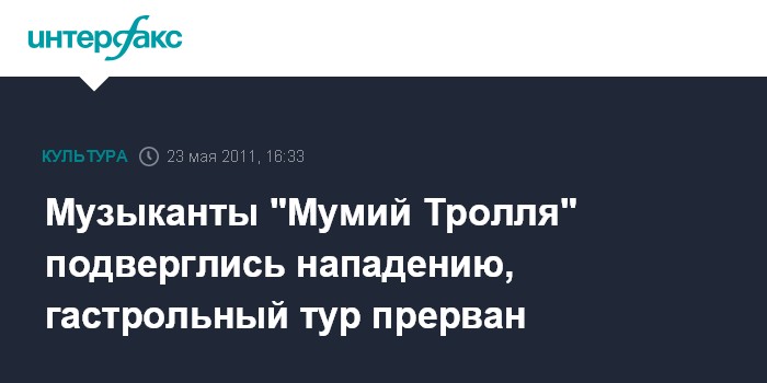Москва. 23 мая. INTERFAX.RU – Директор группы "Мумий тролль" подтвердил в разговоре с корреспондентом агентства факт избиения участников группы. По его словам, заявление о случившемся уже подано в суд.