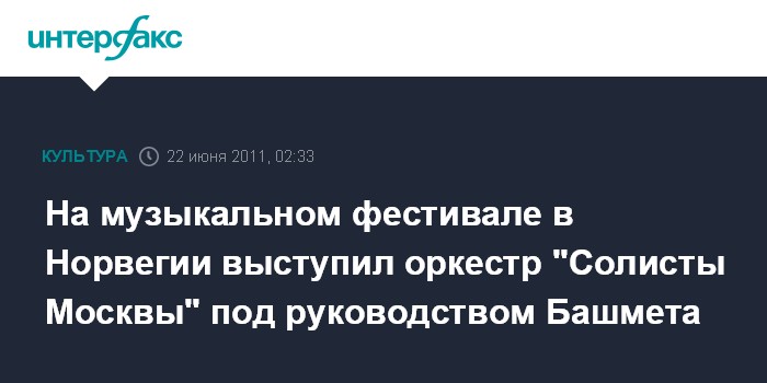 Харстад. 22 июня. ИНТЕРФАКС - Юрий Башмет со своим оркестром "Солисты Москвы" стал во вторник сенсацией музыкального фестиваля в норвежском городе Харстад, передает корреспондент "Интерфакса".