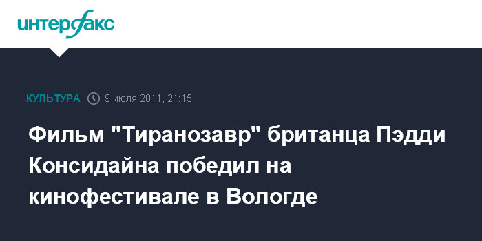 Вологда. 9 июля. ИНТЕРФАКС - Дебют британского режиссера Пэдди Консидайна "Тиранозавр" призван лучшим фильмом закончившегося в субботу в Вологде Второго международного кинофестиваля молодого европейского кино "Voices".