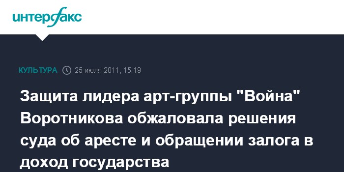 Санкт-Петербург. 25 июля. INTERFAX.RU - Защитники лидера арт-группы "Война" Олега Воротникова обжаловали судебные решения об обращении залога в доход государства, а также о заочном аресте своего клиента, сообщила "Интерфаксу" в понедельник его адвокат Анастасия Екимовская. "Мы обжаловали оба судебных решения - и об обращении залога в доход государства, и о заочном аресте", - сказал Екимовская.