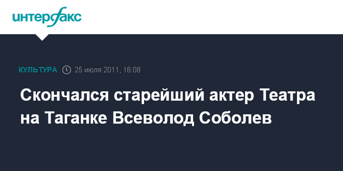 Москва. 25 июля. INTERFAX.RU - Старейший актер Театра на Таганке, народный артист России Всеволод Соболев умер в Москве в воскресенье на 72-м году жизни, сообщили в понедельник "Интерфаксу" в театре.