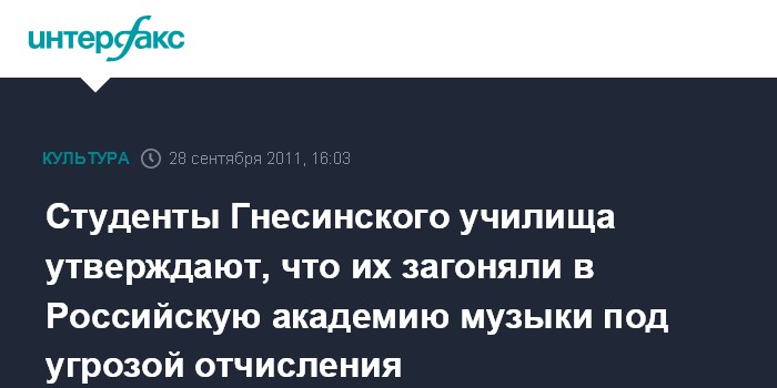 Москва. 28 октября. INTERFAX.RU - Студенты музыкального колледжа имени Гнесиных заявляют, что под угрозой отчисления подписали документ о согласии на перевод на обучение в Российскую академию музыки имени Гнесиных в связи со слиянием академии и колледжа.