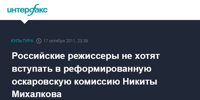 Москва. 17 октября. INTERFAX.RU - Российские режиссеры и сценаристы - лауреаты и номинанты премии "Оскар" заявили о своей неготовности войти в реформированную оскаровскую комиссию, сообщил в понедельник "Интерфаксу" кинорежиссер Сергей Бодров.