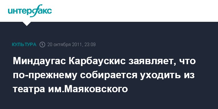 Ранее "Интерфаксу" стало известно, что Карбаускис, назначенный в мае 2011 года на должность худрука театра вместо уволившегося Сергея Арцибашева, написал заявление об уходе, так как не сработался с директором театра Евгений Куриленко.