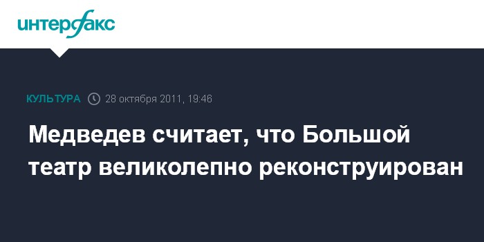 Москва. 28 октября. INTERFAX.RU - Президент РФ Дмитрий Медведев сравнил с "великим чудом" открытие исторической сцены Большого театра, подчеркнув, что ГАБТ - это один из величайших национальных брендов России.