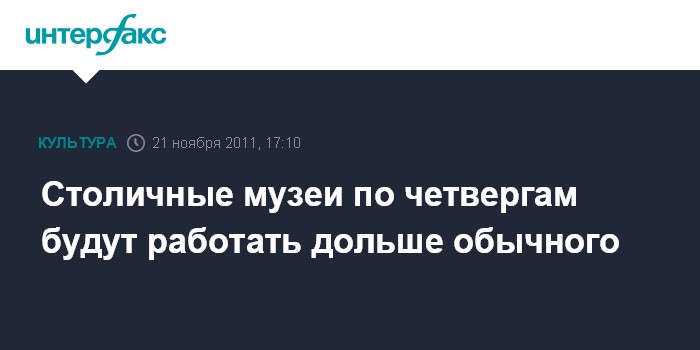 "Руководитель департамента культуры Сергей Капков подписал приказ "О дальнейшем развитии акции "Вечер в музее". До настоящего времени музеи, подведомственные департаменту, самостоятельно принимали решение о том, в какой из дней недели продлить работу до 21:00 часов", - рассказал собеседник агентства.