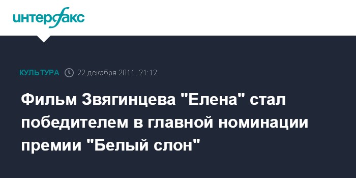 Москва. 22 декабря. INTERFAX.RU - Фильм Андрея Звягинцева "Елена" стал обладателем Национальной премии кинопрессы "Белый слон" в главной номинации "лучший фильм года", сообщил в четверг "Интерфаксу" режиссер кинокартины. "Я рад нашему неожиданному равновесию с критической мыслью", - сказал, получая награду, Звягинцев.