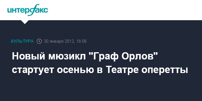 Москва. 27 января. INTERFAX.RU - Команда создателей "Монте-Кристо" приступила к постановке нового мюзикла "Граф Орлов". Оригинальный спектакль по историческим событиям времен Екатерины Великой сменит сверхпопулярный "Монте-Кристо", который идет на сцене Театра оперетты вот уже четвертый год.