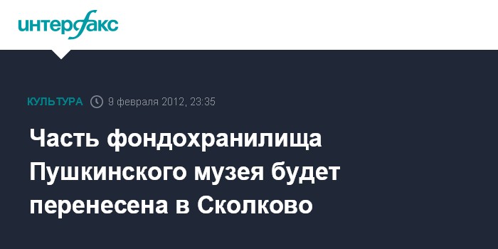 Москва. 9 февраля. INTERFAX.RU - Министр культуры РФ Александр Авдеев заявил, что часть фондохранилища Государственного музея изобразительных искусств имени Пушкина будет перенесена в Сколково, где впоследствии откроется музей.
