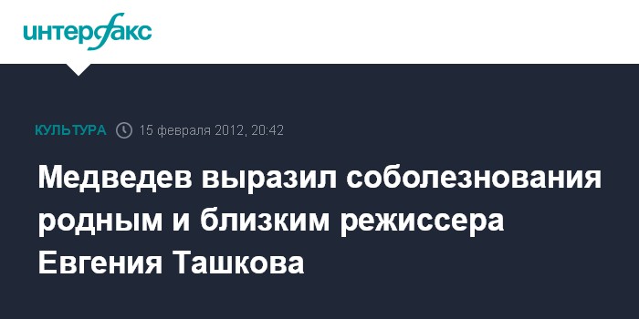 Москва. 15 февраля. INTERFAX.RU - Президент РФ Дмитрий Медведев выразил соболезнования родным и близким кинорежиссера Евгения Ташкова в связи с его кончиной.