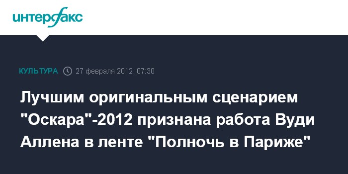 Москва. 27 февраля. INTERFAX.RU - "Оскара" за Лучший оригинальный сценарий в 2012 г. удостоился Вуди Аллен за работу в фильме "Полночь в Париже".