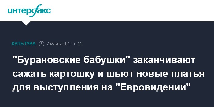 Ижевск. 2 мая. INTERFAX.RU - "Бурановские бабушки" заканчивают подготовку к выступлению на конкурсе "Евровидение-2012": проводят репетиции в родном селе Бураново, примеривают специальные легкие национальные удмуртские платья и готовятся передать в руки соседей и родственников свои хозяйства.