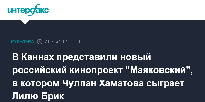 Канны. 24 мая. INTERFAX.RU - Чулпан Хаматова исполнит роль Лили Брик в новом фильме "Маяковский", рассказал режиссер картины Александр Шейн. "Она, правда, ломается, отказывается, но без нее я фильма не вижу", - заявил в четверг на презентации проекта в рамках Каннского фестиваля режиссер.