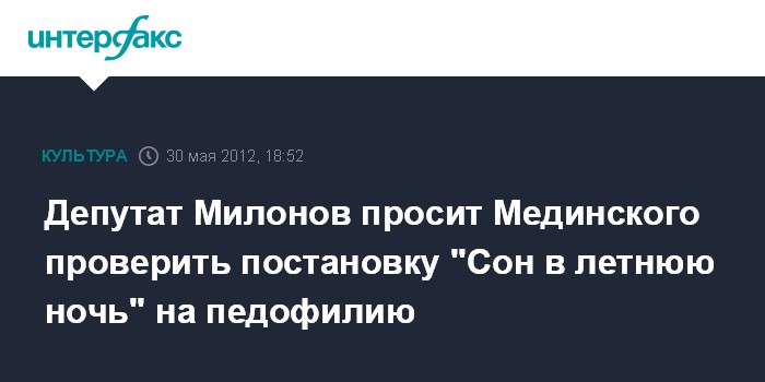 Санкт-Петербург. 30 мая. INTERFAX.RU - Депутат петербургского парламента Виталий Милонов написал обращение к министру культуры РФ Владимиру Мединскому с просьбой проверить постановку оперы "Сон в летнюю ночь", премьера которой пройдет 10 июня на сцене Музыкального театра им. Станиславского и Немировича-Данченко.