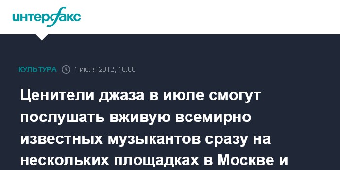 Москва. 1 июля. INTERFAX.RU - Концертные площадки Москвы и Сочи в начале июля примут у себя сразу несколько звезд джаза мирового уровня и их группы, сообщили "Интерфаксу" в Клубе Игоря Бутмана, являющегося организатором гастролей.