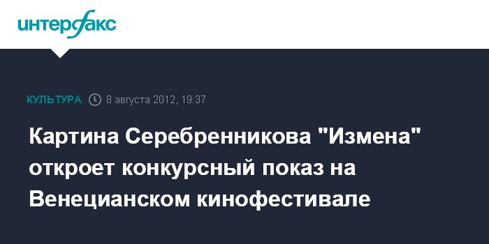 Москва. 8 августа. INTERFAX.RU - Фильмом Кирилла Серебренникова "Измена" откроется конкурсный показ 69-го Венецианского кинофестиваля, сообщили в среду "Интерфаксу" в пресс-службе фестиваля