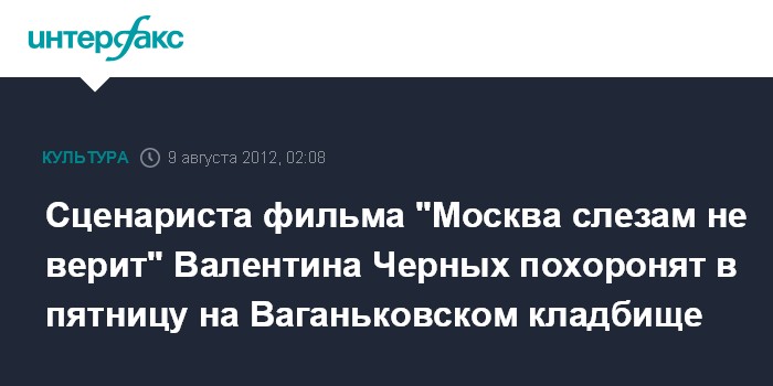 Москва. 9 августа. ИНТЕРФАКС - Кинодраматург, автор сценария к оскароносному фильму "Москва слезам не верит" Валентин Черных будет похоронен в пятницу, 10 августа, на Ваганьковском кладбище в Москве, сообщили в четверг "Интерфаксу" в Союзе кинематографистов РФ.