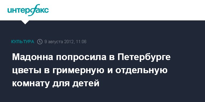 Между тем Мадонна выдвинула требования по обустройству гримерной комнаты: пол в ней должен быть застелен ковролином, а непосредственно рядом с помещением должна находиться дополнительная комната для детей. Приедут ли они в Петербург, не сообщается.