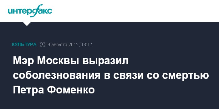 Москва. 9 августа. INTERFAX.RU - Мэр Москвы Сергей Собянин выразил соболезнования в связи со смертью режиссера, народного артиста России Петра Фоменко, сообщает официальный портал мэра и правительства столицы.